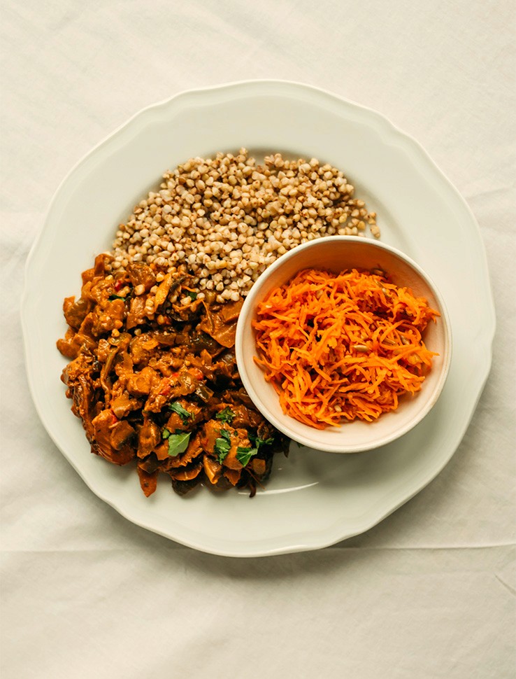 Strogonoff z tempehem i grzybami, kasza gryczana i marchewka z jabłkiem