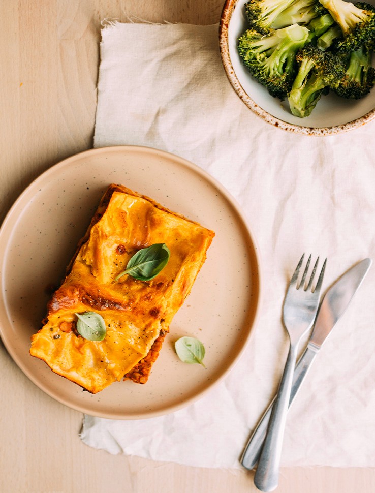Lasagne z ragu z soczewicy i pieczarek, zielone warzywa