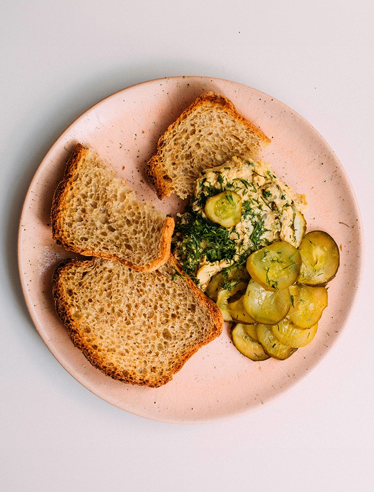 Pasta bezjajeczna, ogórek kiszony, zioła, nasz chleb